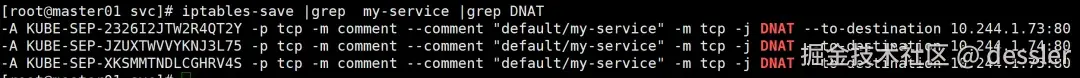 -A KUBE-SEP-2326I2JTW2R4QT2Y -p tcp -m comment --comment "default/my-service" -m tcp -j DNAT --to-destination 10.244.1.73:80