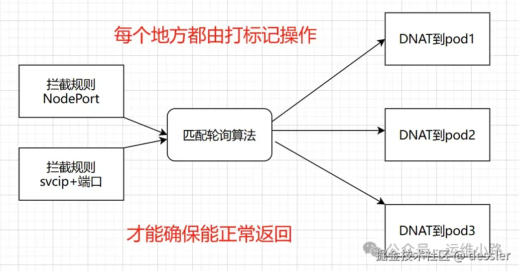 上面这2条规则也是主要起标记作用,下面3条就是真正的核心的转发逻辑,由于这个pod只有3个后端,所以这里就只有3条,这里的数量是由正常可用的pod数量决定的。