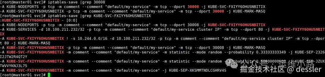这个规则其实和前面那个规则逻辑是一样的,只是这个规则命中的是svc的ip+端口,然后也是往KUBE-SVC-FXIYY6OHUSNBITIX继续处理。