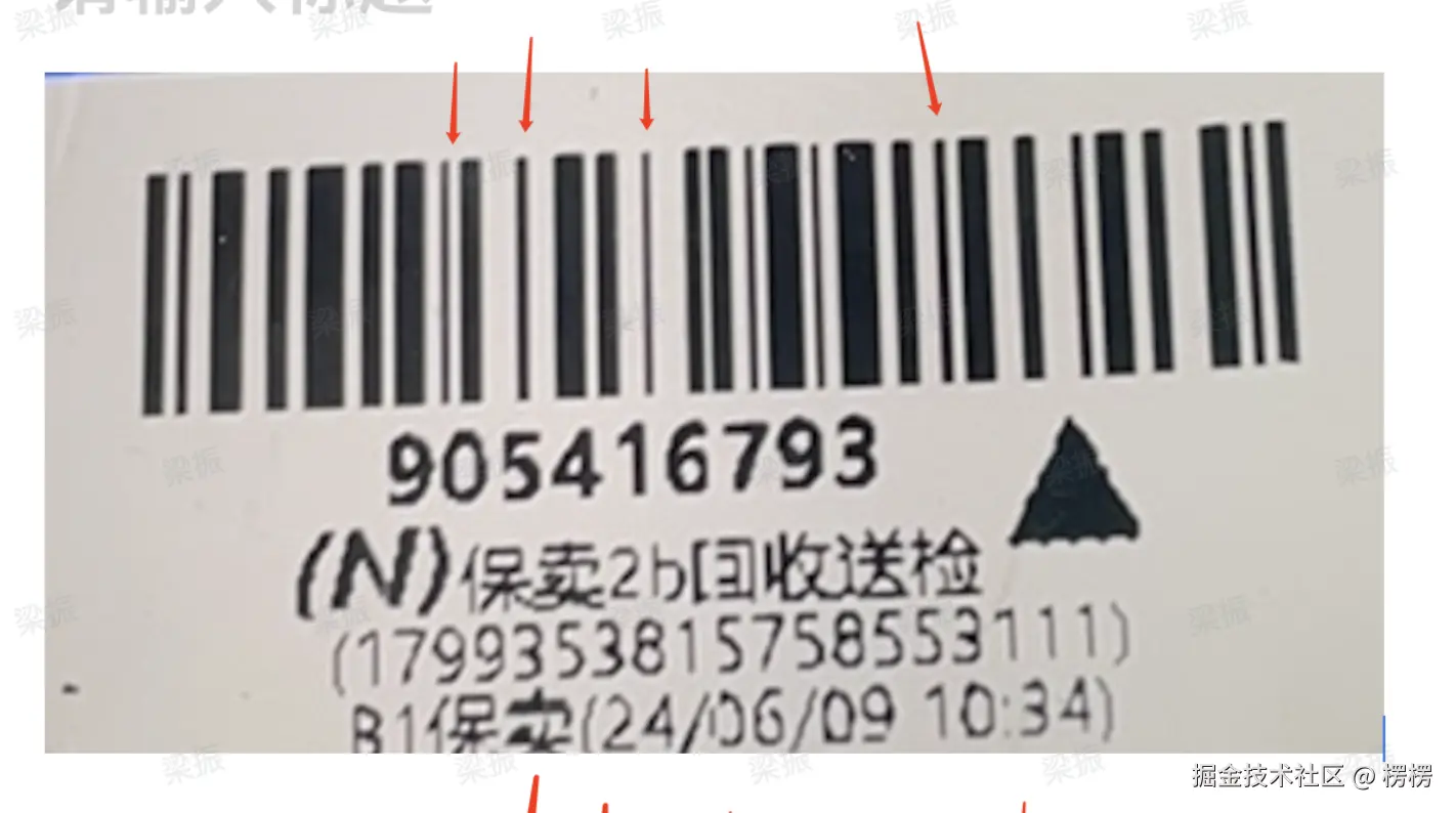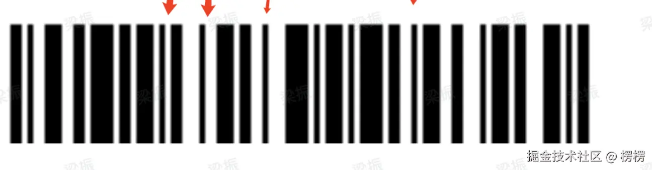 • 扫描条纹:从左到右(或从上到下)扫描条形码,记录黑条和白条的宽度。例如,记录为一系列宽度值:[2, 1, 3, 1, 2, …]。