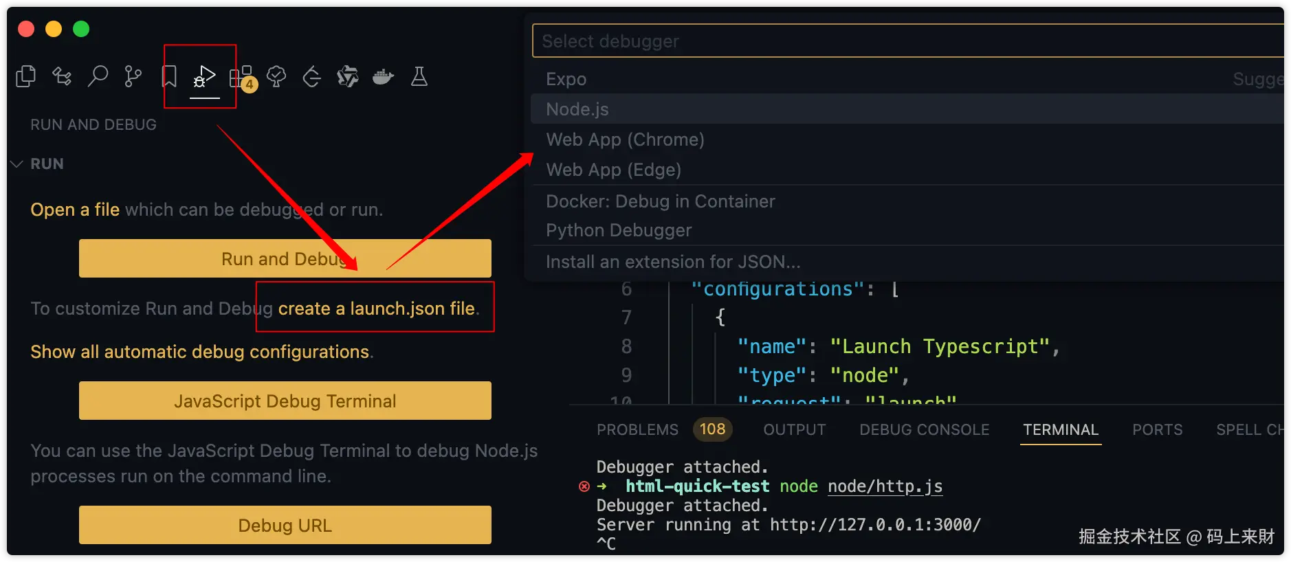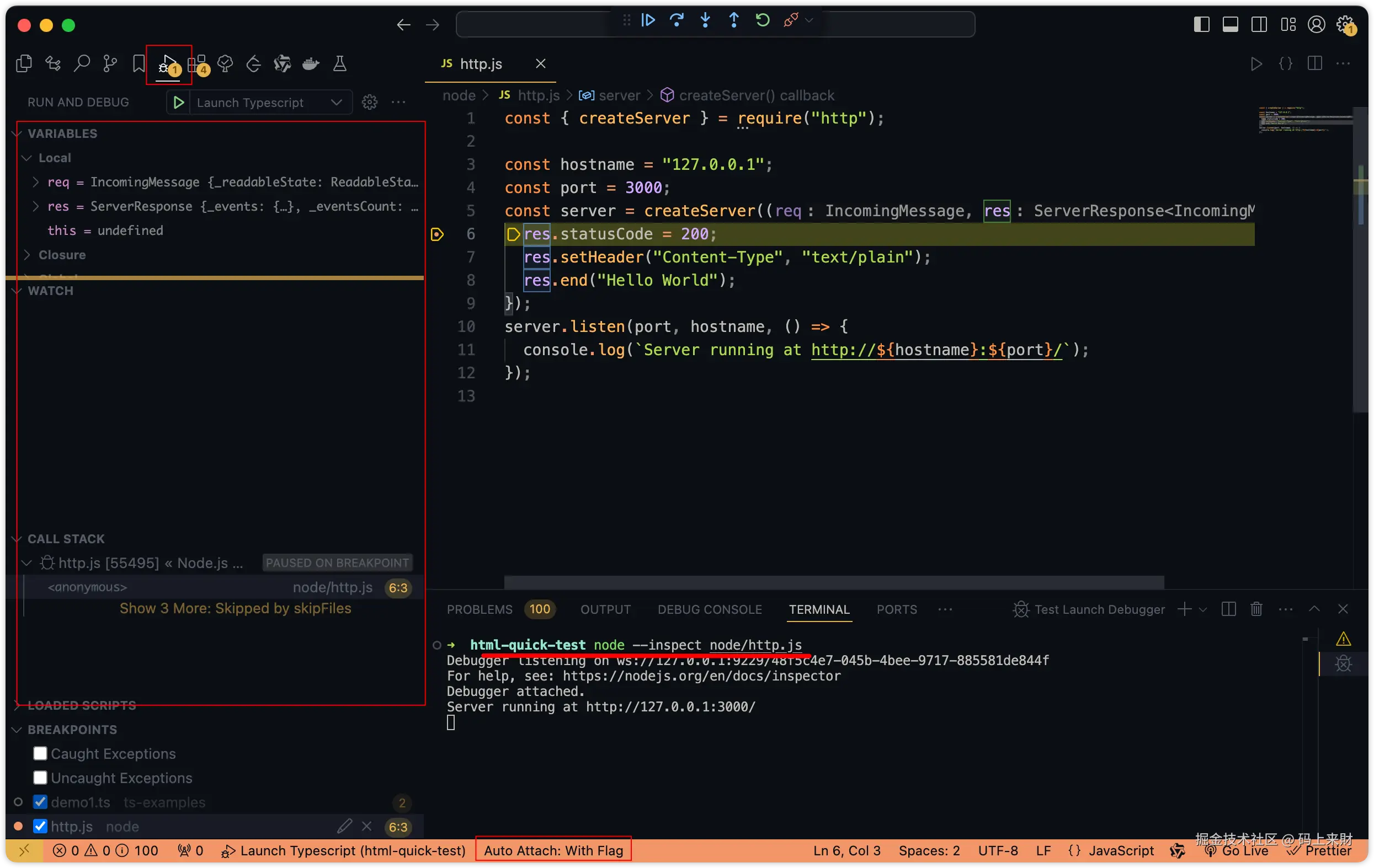 简单的调试可以快速的进入调试,无需关心过多的外在因素,通常这类的调试偏向于简单、无需相关工具辅助之类的项目,如:简单的原生js工程、NodeJS工程等等。简单的调试这里会介绍:auto attach、Javascript Debug Terminal