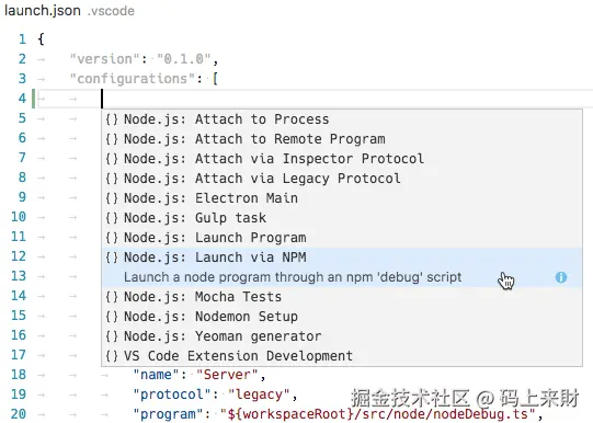 在launch.json中可以快速创建对应类型的配置,vscode给了对应的配置