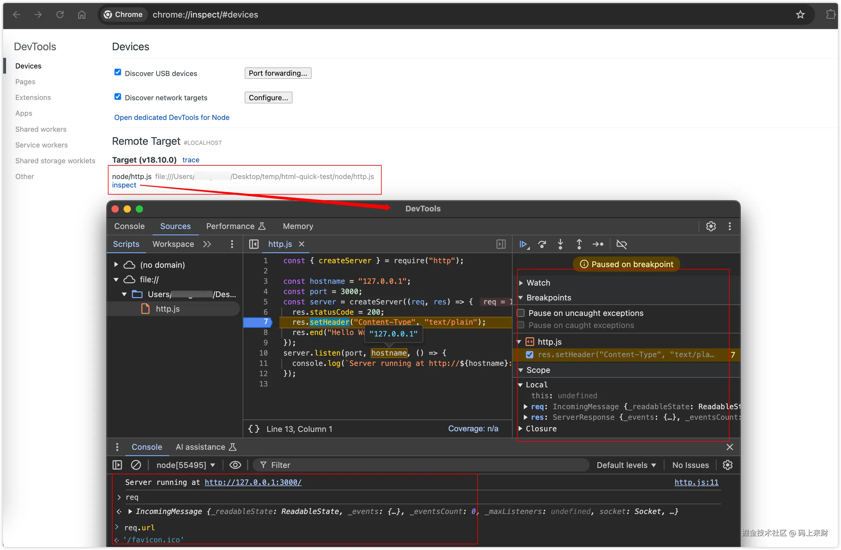 这个其实和前面介绍的auto attach 以及用 Chrome 进行调试道理是一样的