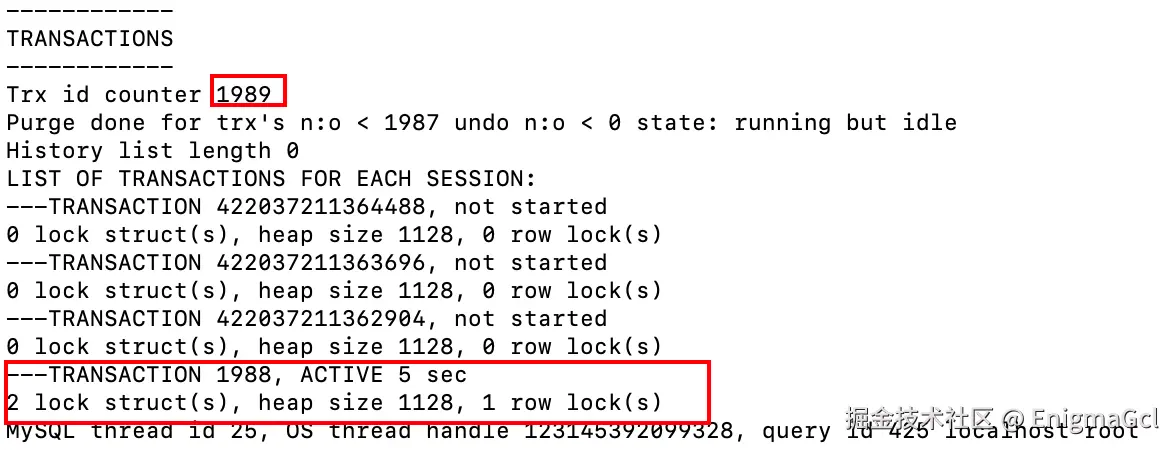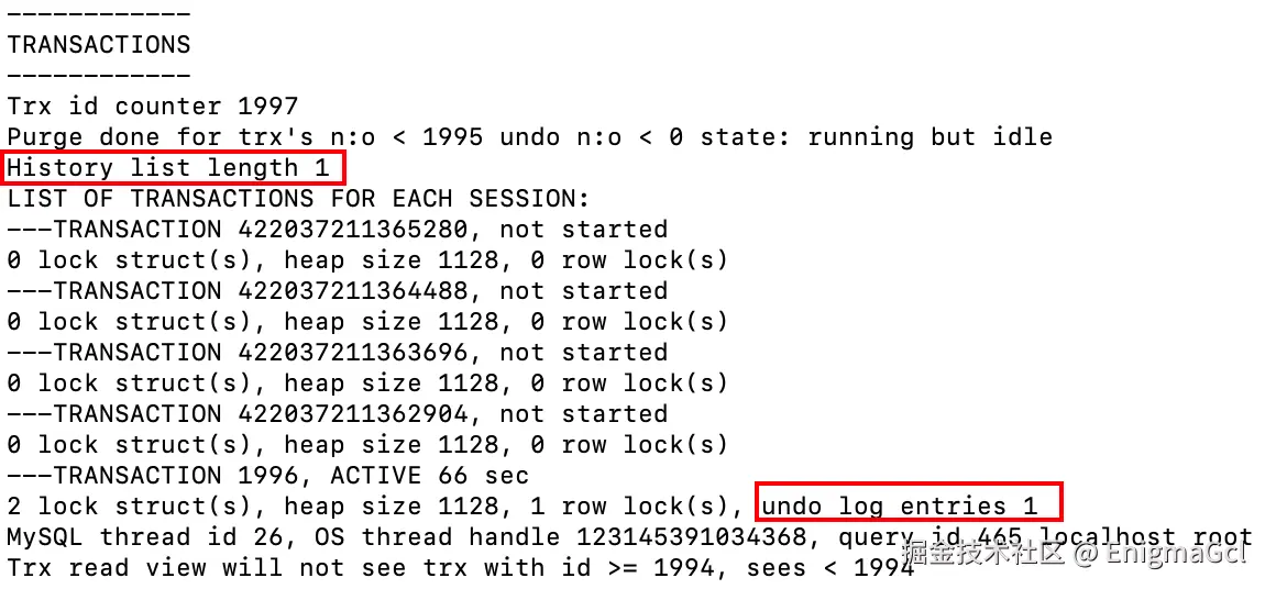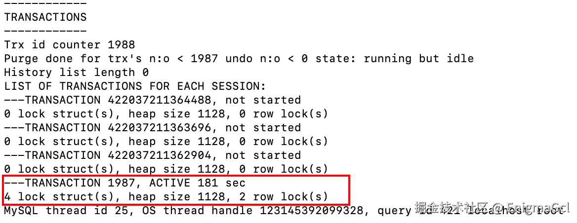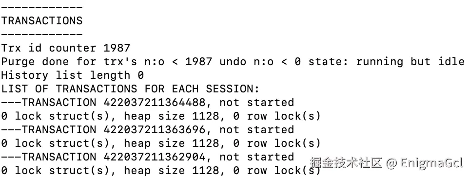 show engine innodb status 结果很长,但我们只用关注事务状态即可,即关注下面内容: