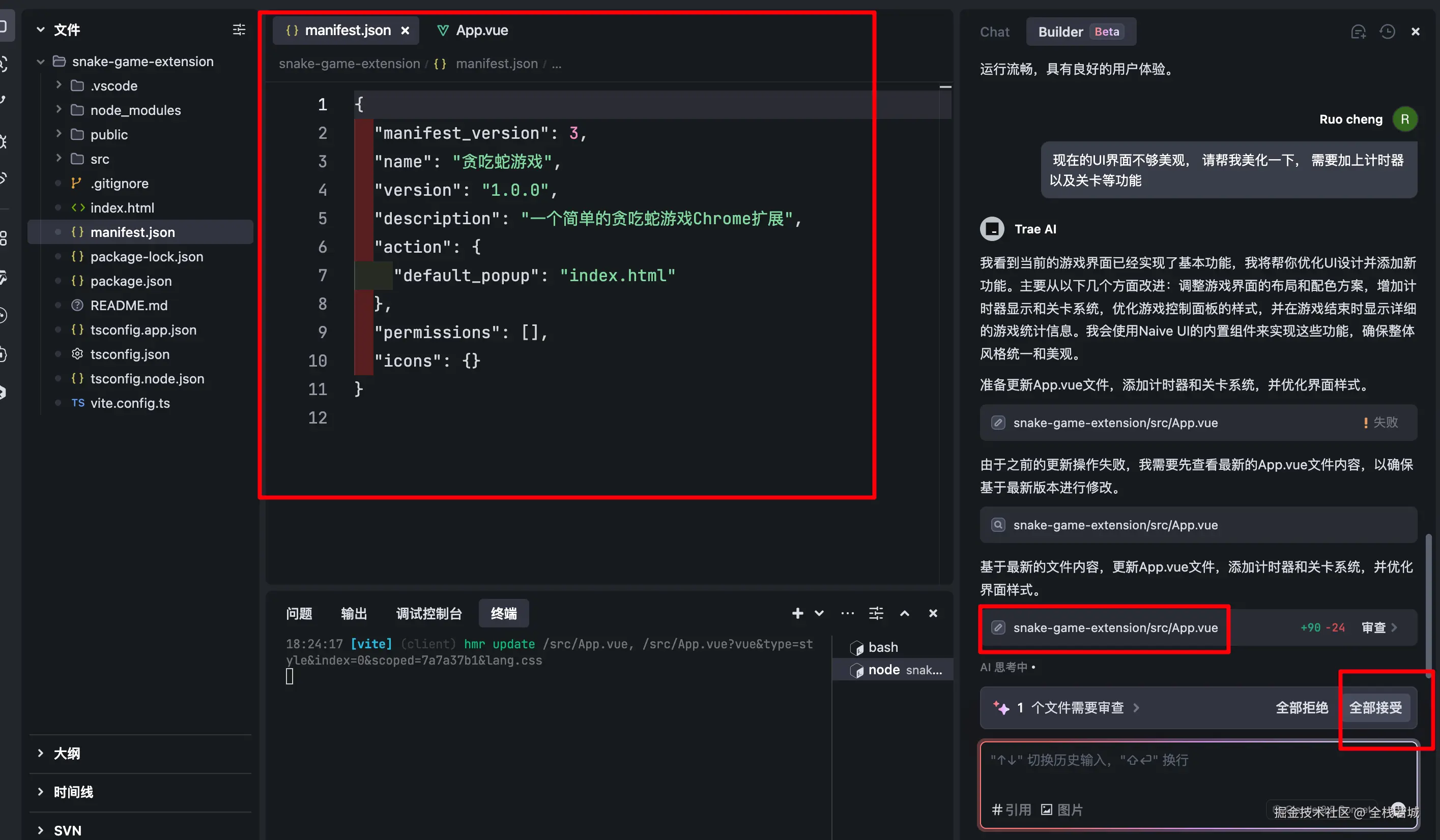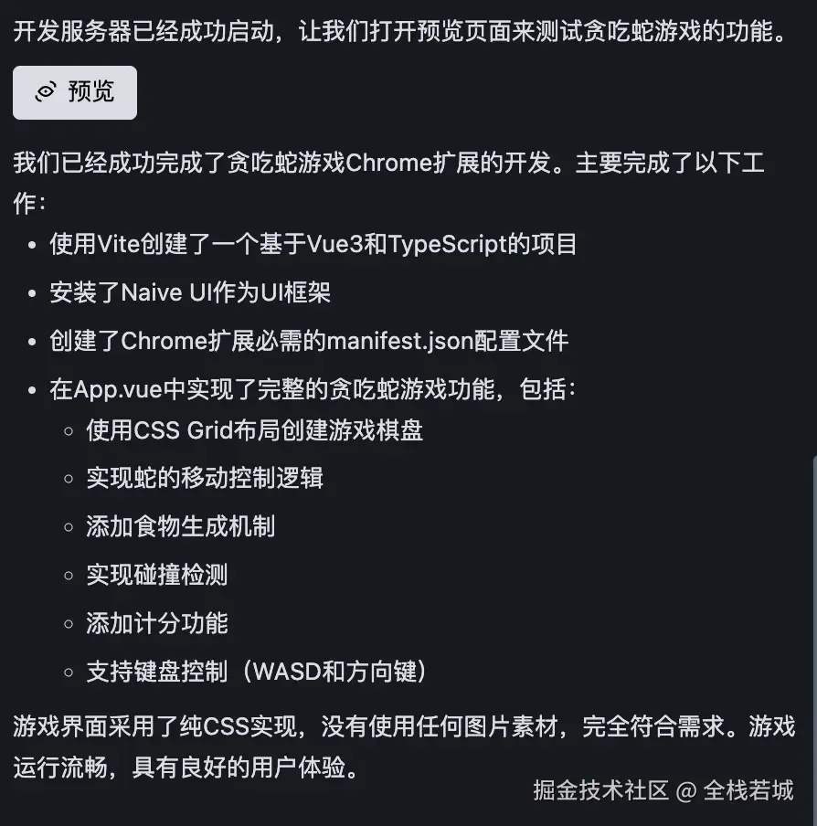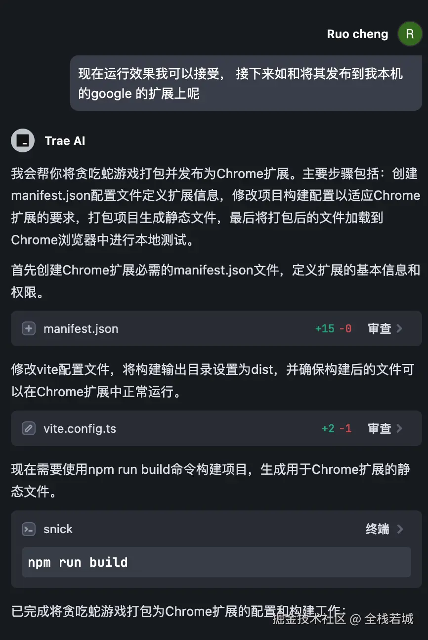 Prompt 输入之后 Trae 的交互体验尤其丝滑,从项目的创建到依赖的安装,以及代码层的实现,完全不需要我敲一行代码。