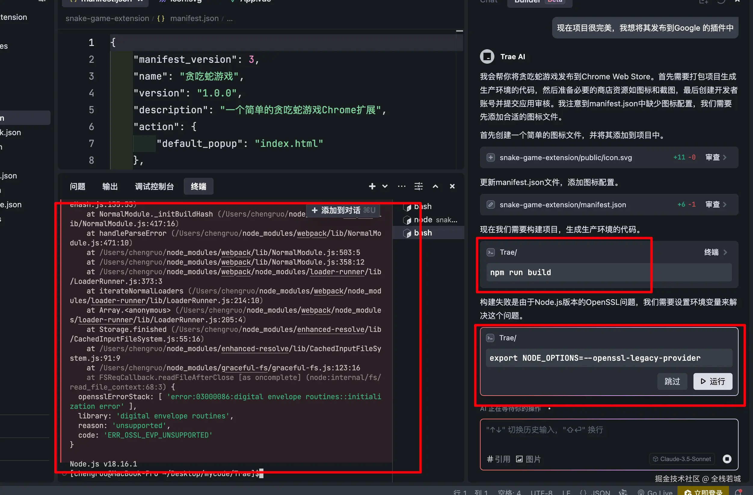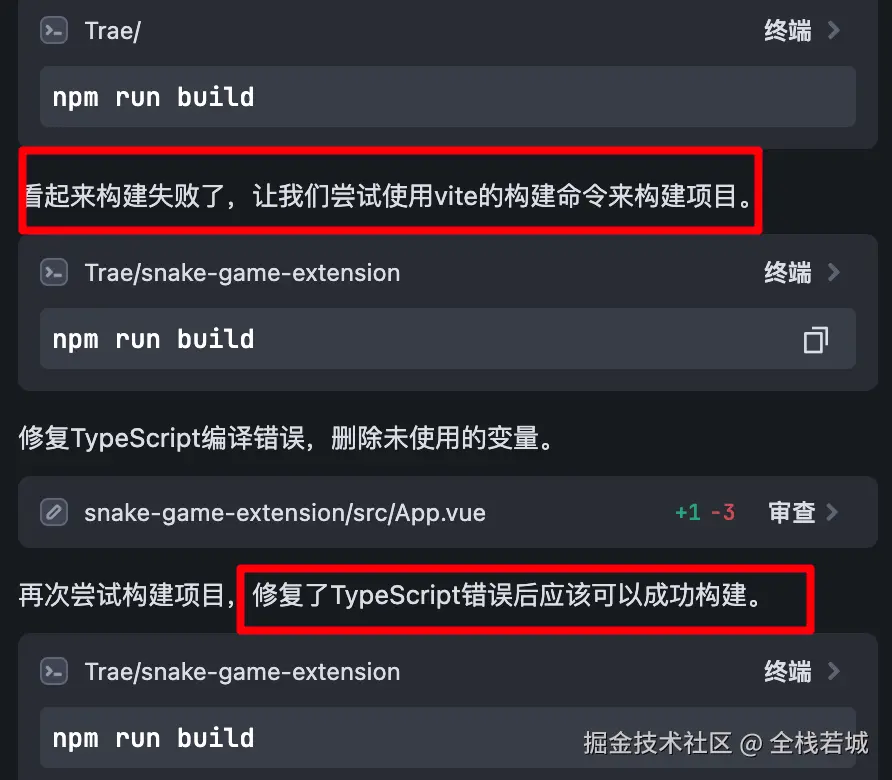 如下图所示 在执行 build 的过程中报错了 , Trae 依旧可以识别并给出相关操作