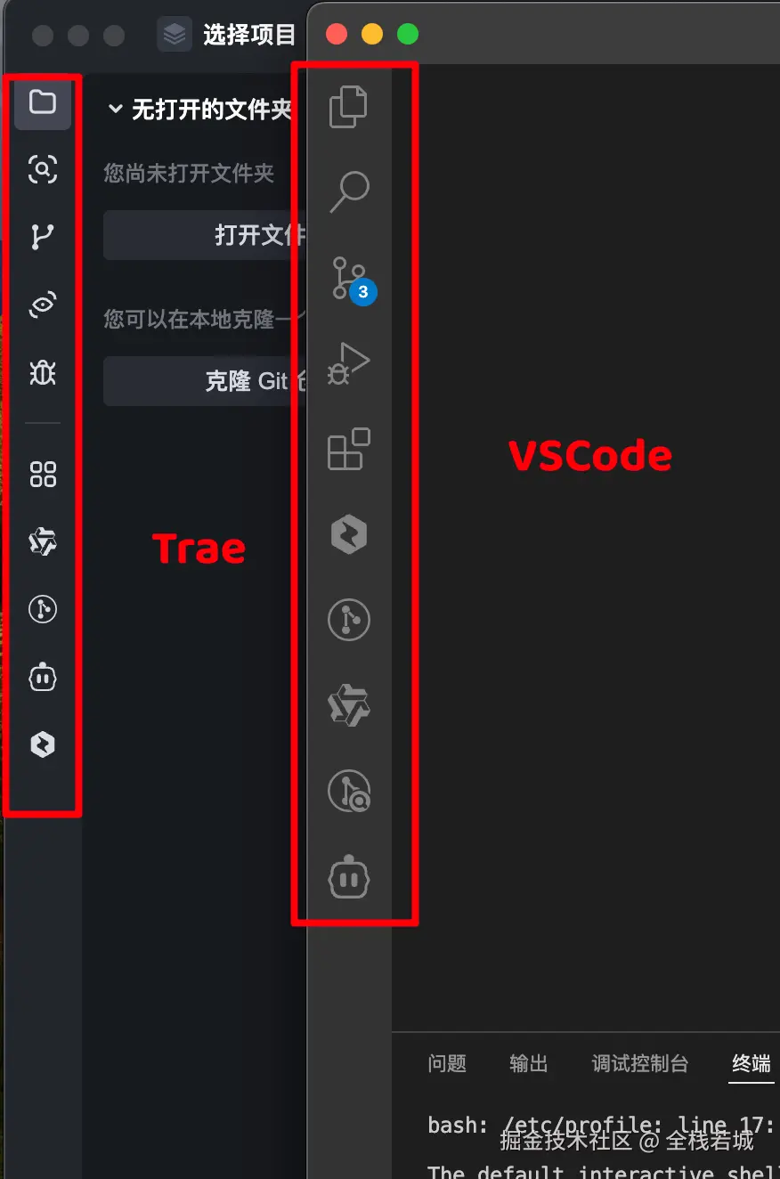 如图所示,左侧的侧边栏中展示的插件,正是我在 VSCode 中已经安装的。在 Trae 中,我无需重新配置这些插件,这一功能极大地节省了我的设置时间。