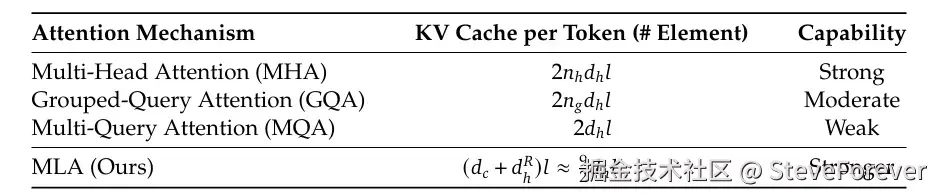 下表比较了 KV 缓存所需的元素数量(每个 Token)以及 MHA、GQA、MQA 和 MLA 之间的建模能力,表明 MLA 确实可以在内存效率和建模能力之间实现更好的平衡。