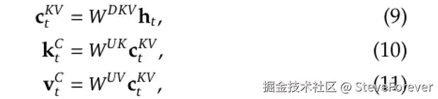 这个过程可以用以下方程式描述,其中是潜在向量,是从 (此处上标中的 D 代表“向下投影”,意思是压缩维度),而 都是向上投影矩阵,它们将共享的潜在向量映射回高维空间。