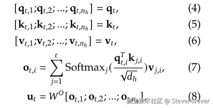 给定一个具有 l 层的模型,如果我们将该层中第 t 个标记(token)的输入表示为 维数为 d 的 ,则需要使用线性映射矩阵将的维数从 d 映射到 。如下图方程所示: