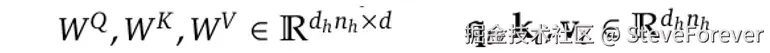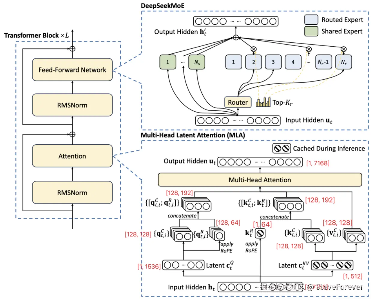- 每个 Head 的维度 d_h:128(非 MLA 时, = Hidden 维度;而 MLA 中,d_h 大于 Hidden 维度 / n_h,比如图中的 128 > 7168/128 = 56)