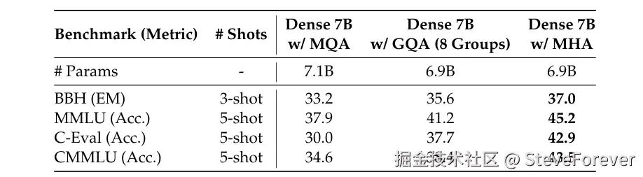 更具体地说,下表显示了 MHA、GQA 和 MQA 在 7B 型号上的性能,其中 MHA 明显优于 MQA 和 GQA。