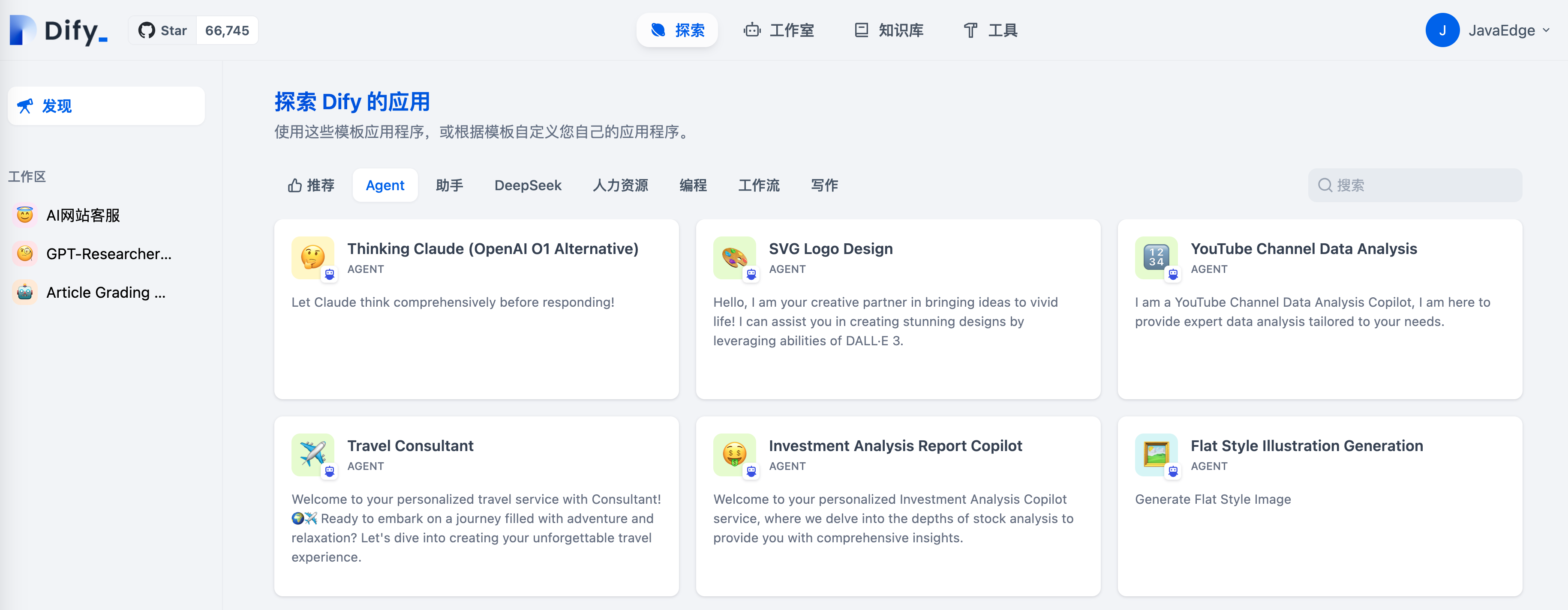 “探索”中找到Agent的应用模板,添加到工作区或在此基础自定义。在工作室也可从0编排一个Agent。