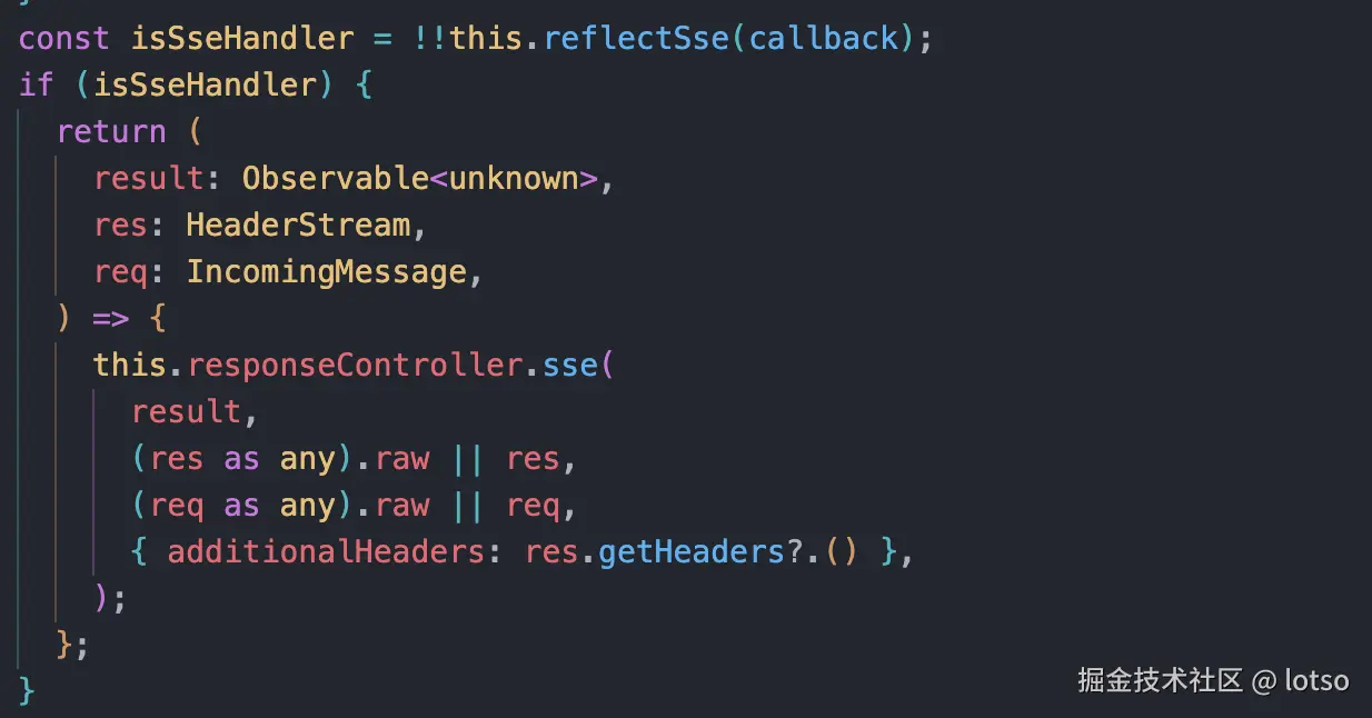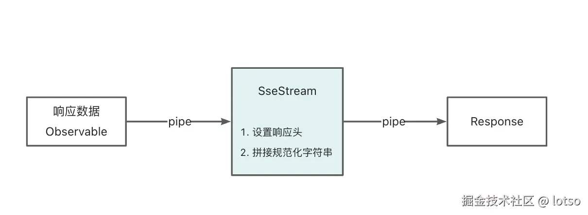 SseStream并 pipe 到 response 上,这是一个Transform流,这里是重点,做了以下两件事:- 设置响应头(Content-Type等)