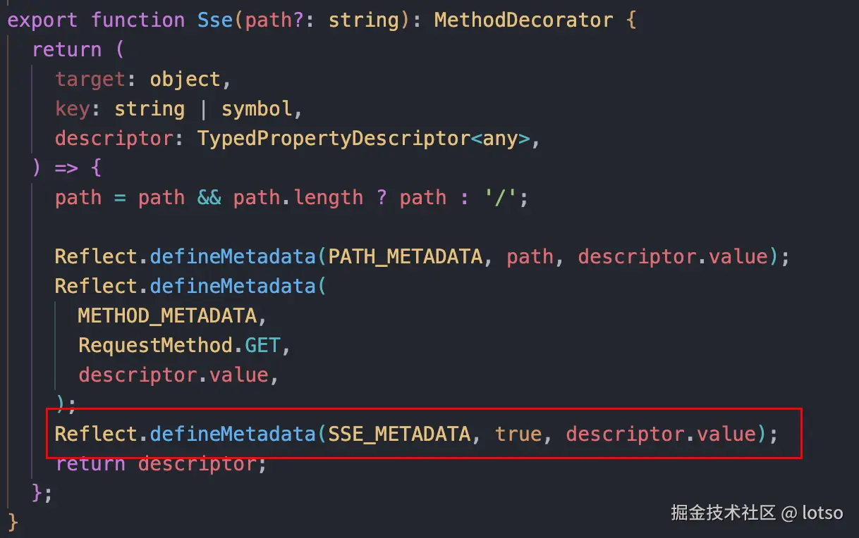 首先 Sse 装饰器会给 Controller 中的处理方法加上 SSE_METADATA 元数据。后续处理会根据此走 SSE 相关逻辑。