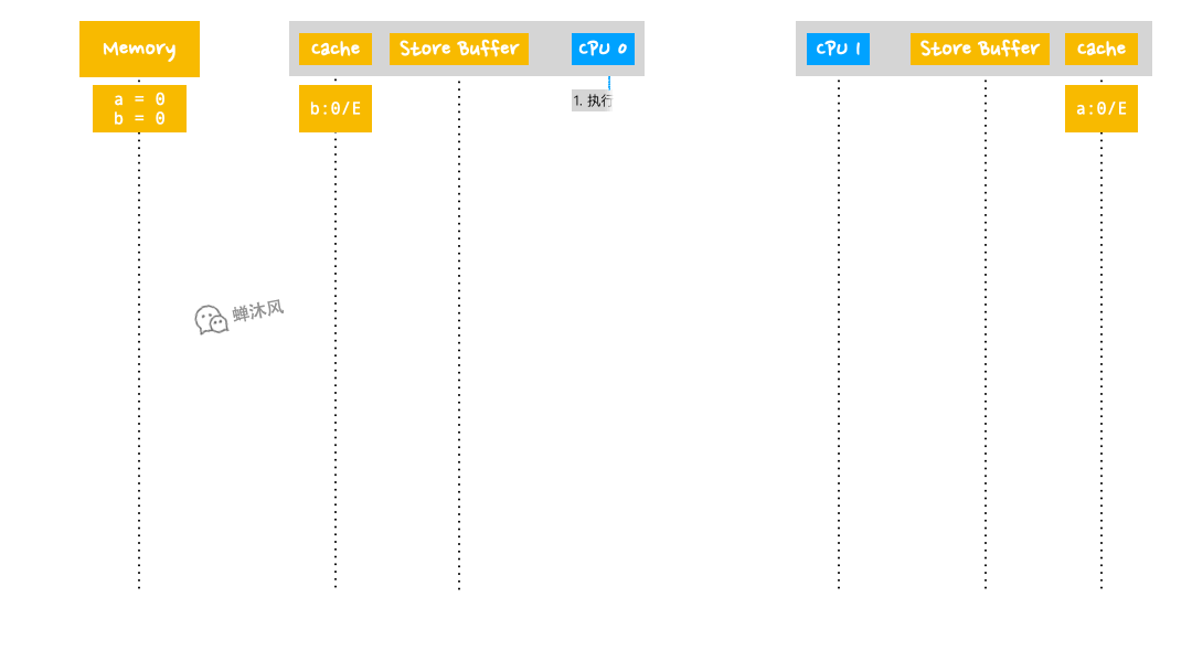 - cpu0 发出命令之后,立即计算,并将结果写入到 store buffer