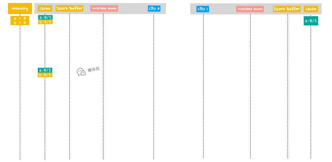 - cpu0 等待其他核的ack结果之后,决定丢弃或者将 store buffer中的最新值写入到缓存行