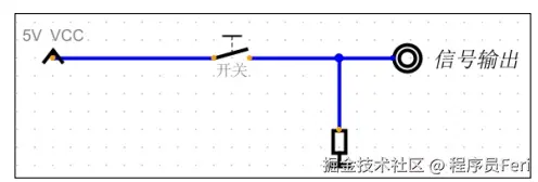 下面的一个电路图: 当开关闭合,信号输出就有 5v 电压;当开关断开,由于下拉电阻存在,信号输出电压变为 0,我们可以将信号输出的高电平态视为 1,低电平态视为 0,即可用电表示二进制。