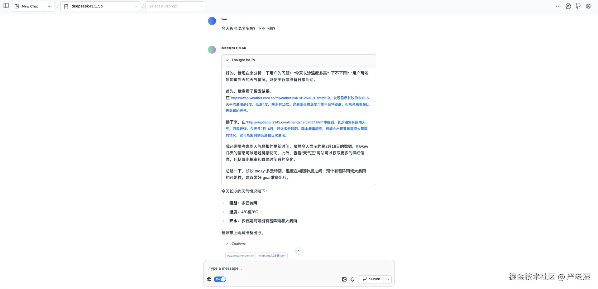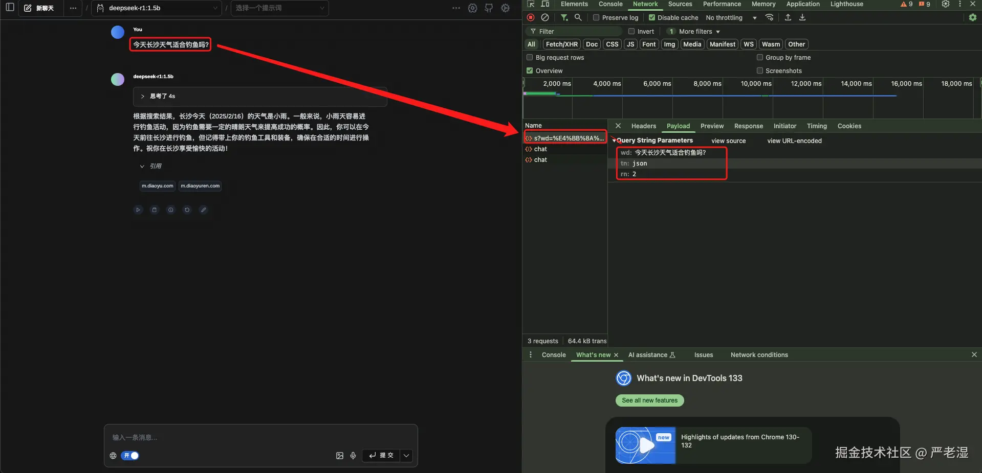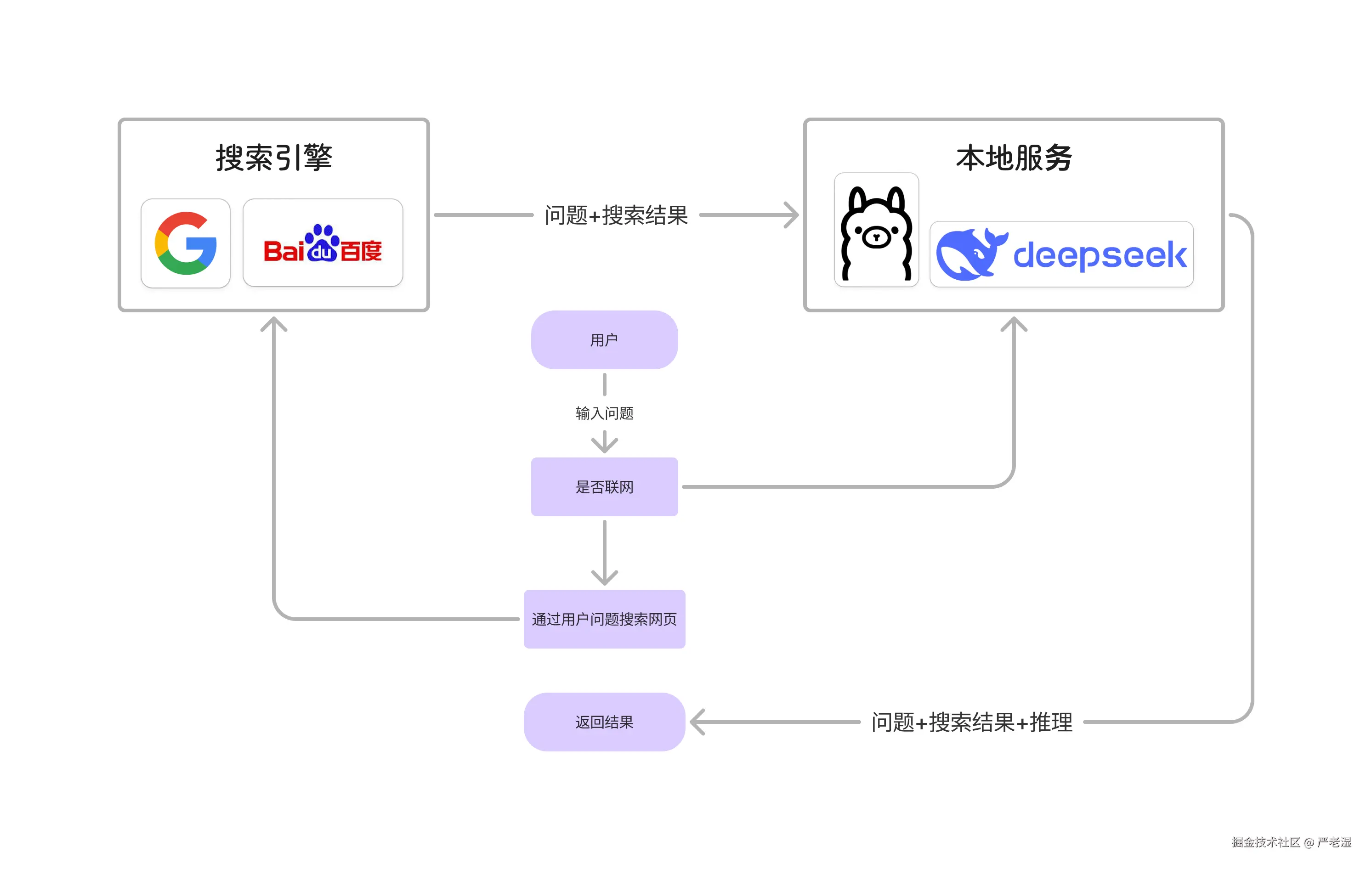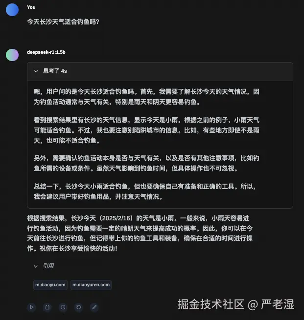 - 发起请求到本地 Llama + DeepSeek,参数是问题 + 搜索结果。