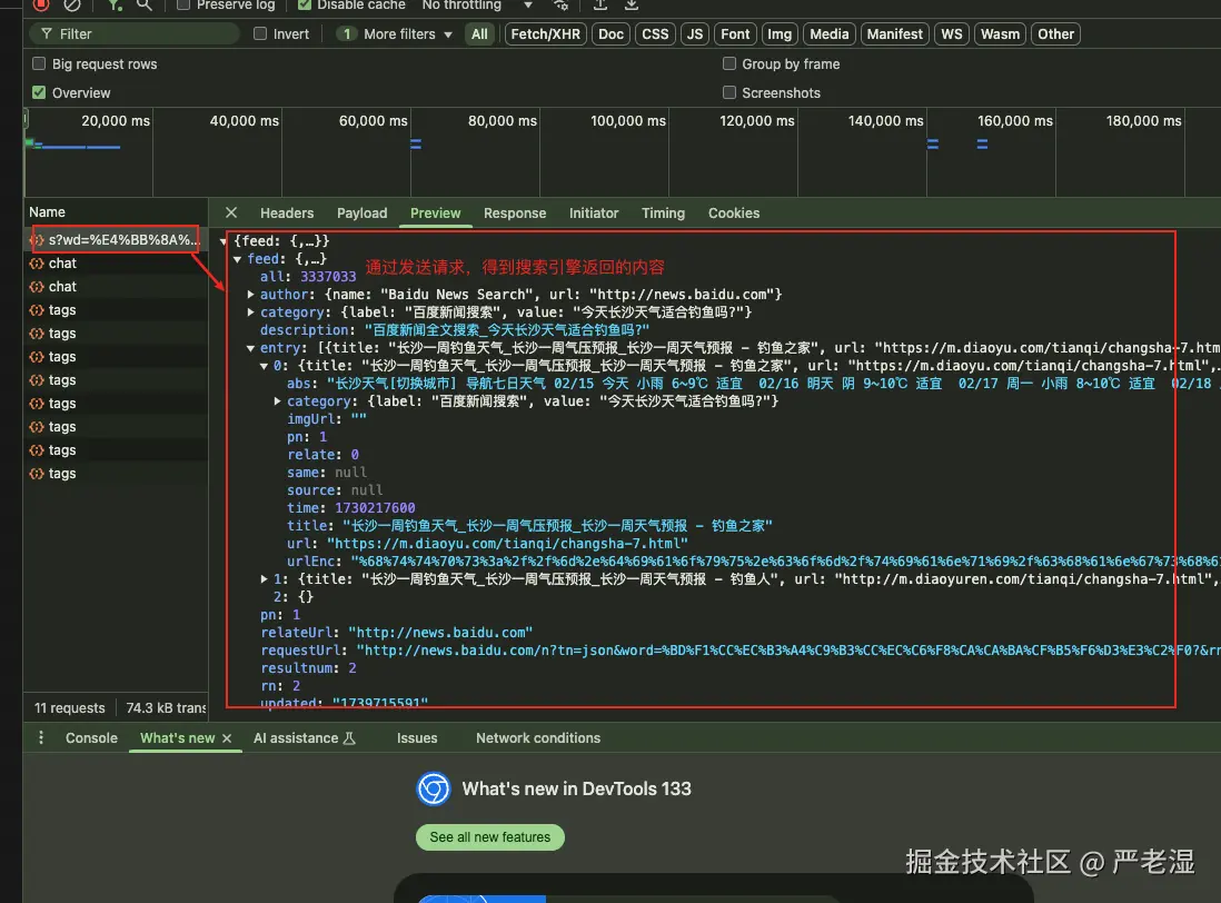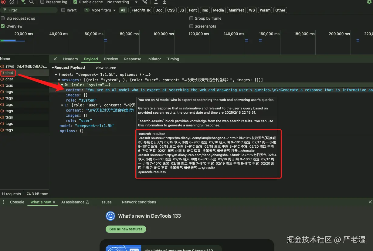 可以看到内容请求参数 message 中第一个内容,将这个搜索结果作为一个 Prompt 的部分内容,可以理解为上下文。