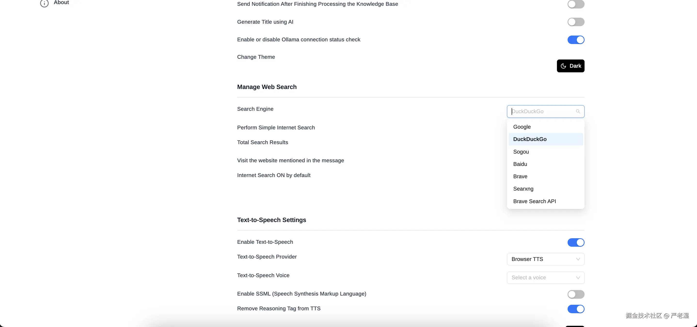 点击右上角的齿轮,你就可以看到这个设置界面在 Manage Web Search 中,修改 Search Engine,也就是搜索引擎,你这里可以选 Google、百度等一系列搜索引擎。点击Save,即可生效。这里还可以选择搜索结果总数,你可以根据自身网络情况来定,因为这需要更多的时间。