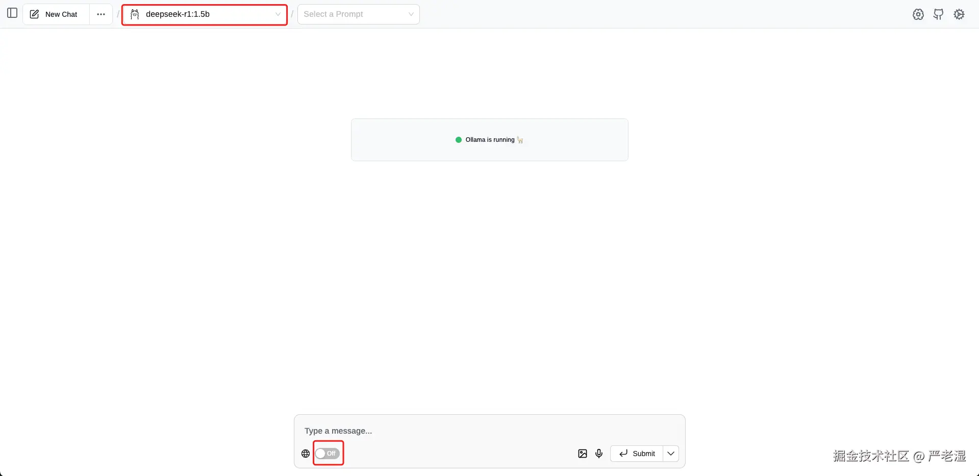 选择本地的模型,然后开启联网。前提是你本地启动了 Ollama。在页面中间位置能过看到这个 Ollama is running 🦙。