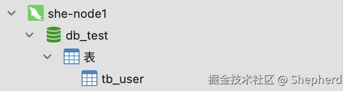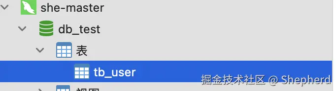 现在你就可以在主库master上操作数据,从库slave1很快就同步了,由于都是新部署的实例,这里我在mater新增一个数据库db_test和一张表tb_user: