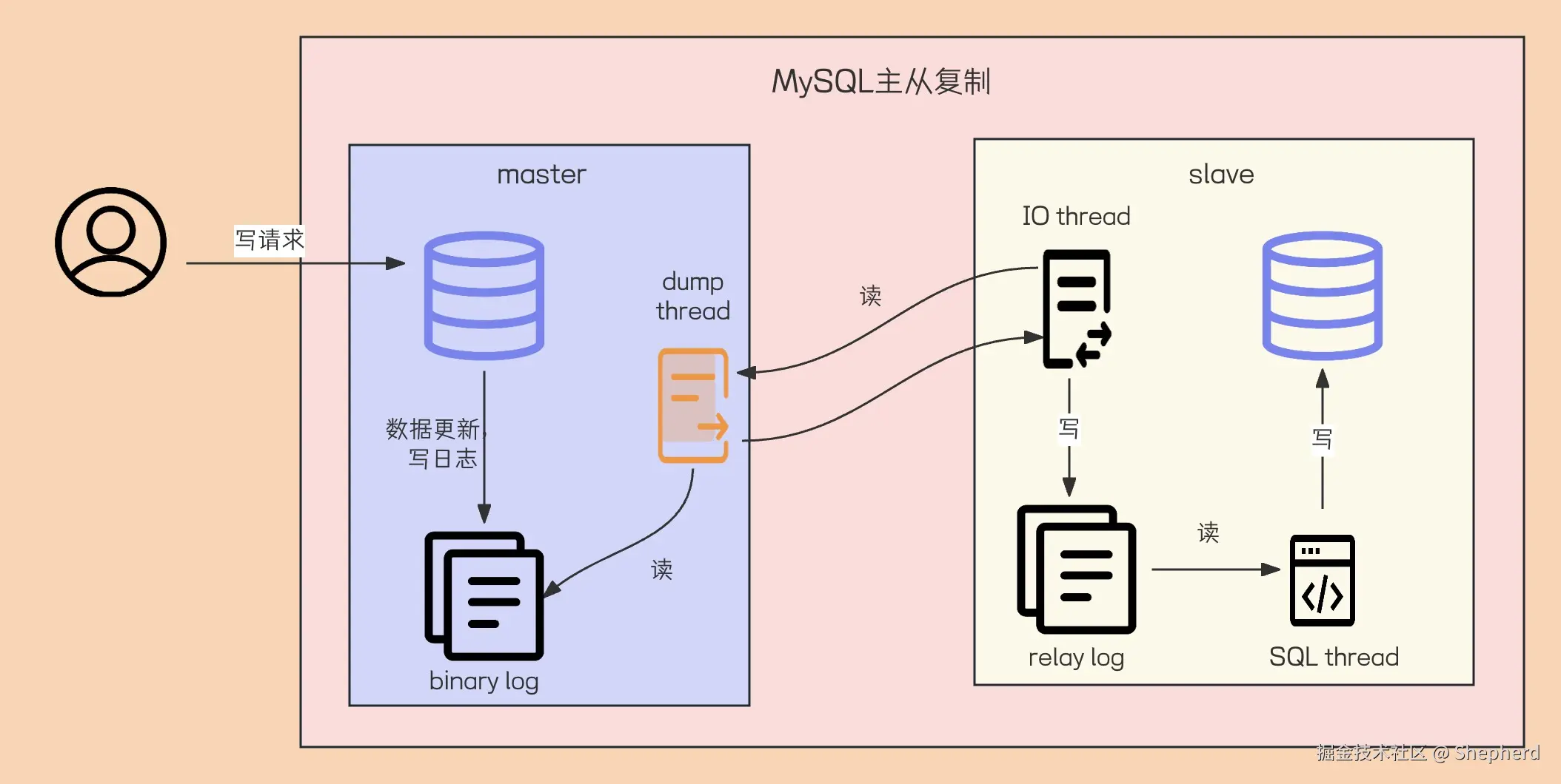 客户端提交写请求,主库master更新数据,并记录binlog