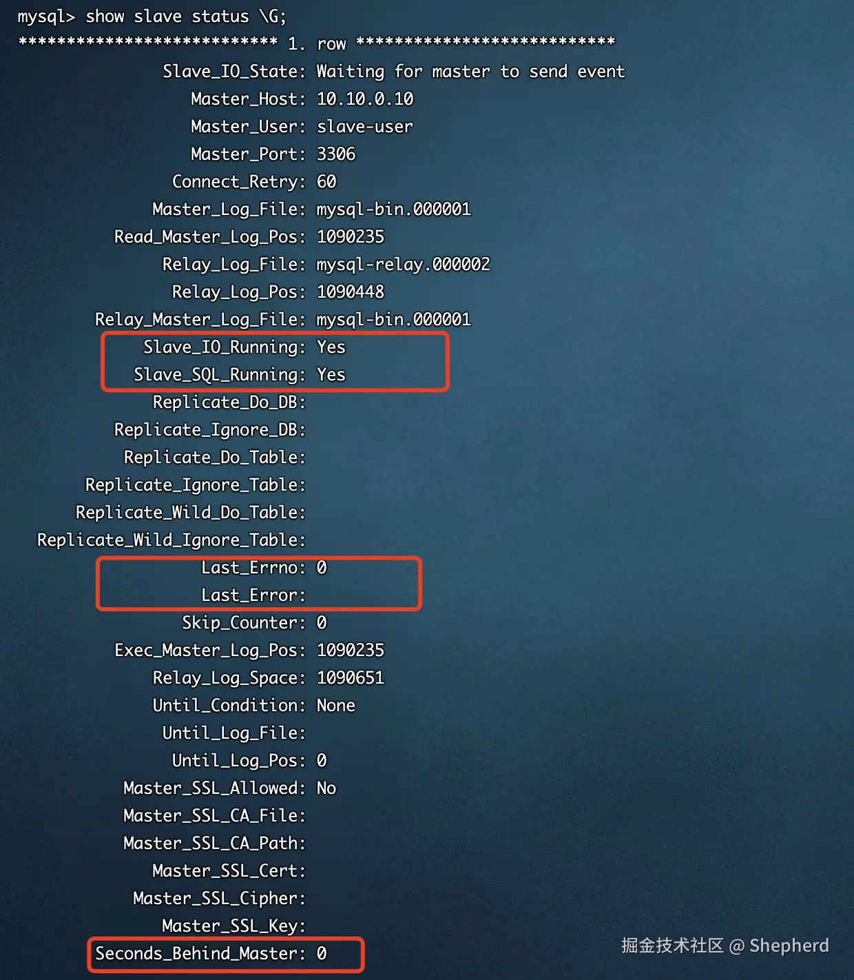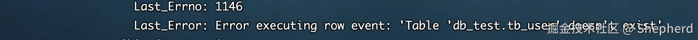 重点关注下我圈出来的参数:Slave_IO_Running和Slave_SQL_Running都是Yes,说明主从配置成功,否则就说明主从同步有问题,就需要看看Last_Error报错信息了,比如说由于主从数据不一致导致的表不存在等: