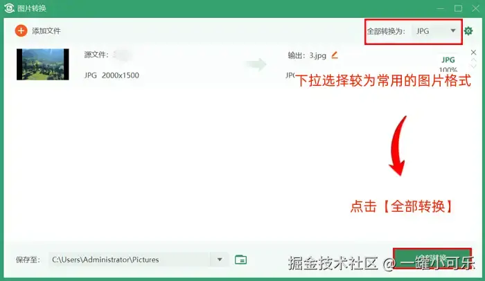 步骤3:单击格式转换界面上方【全部转换为】选项框,下拉选择较为常用的图片格式,如【jpg】格式,然后点击【全部转换】即可。
