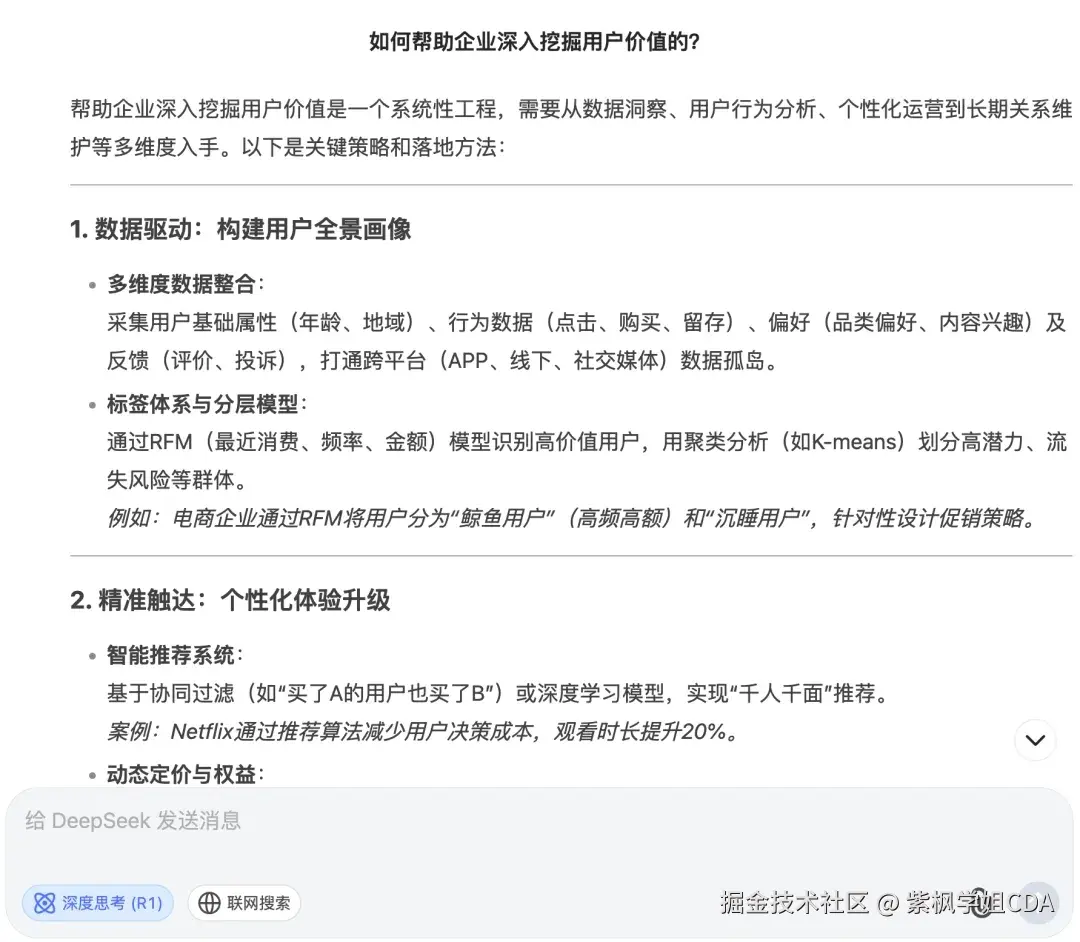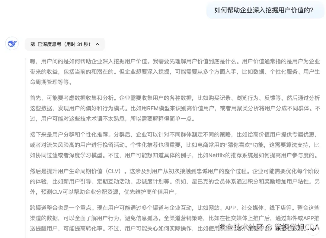 挖掘用户价值本质是让企业从‘赚今天的钱’升级为‘赚未来的钱’,同时让用户从‘被推销’变为‘被满足’。询问deepseek关于挖掘用户价值的方法?deepseek的思考还是非常合逻辑的,其中,用户分群、合个性化推荐几乎所有企业都在用,而这一块也是数据分析师体现个人价值的地方。