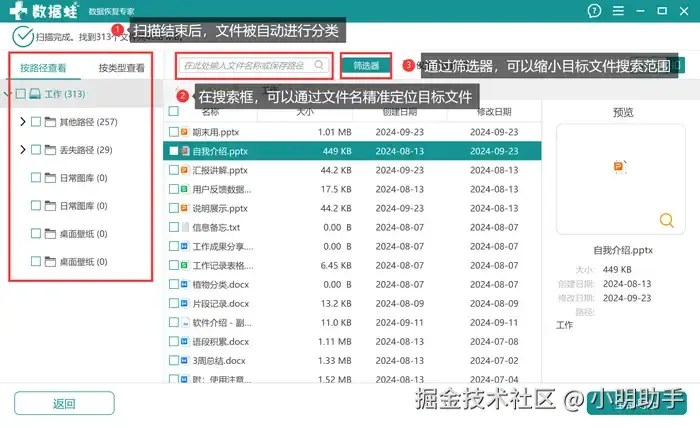 步骤2: 等待软件深度扫描工作完成后,在页面的中间选择需要恢复的文件,有需要的用户还可以选择使用上方的“搜索框”“筛选器”等工具辅助我们更高效率地在大批恢复文件中找到目标;