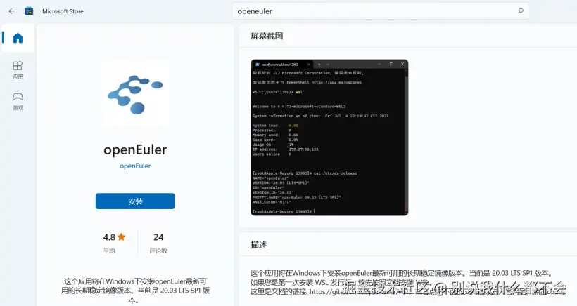 WSL的安装都是程序员的必备技能了,不展开如何开启WSL了。打开Windows Store搜索openEuler,如下图所示,进行安装即可。