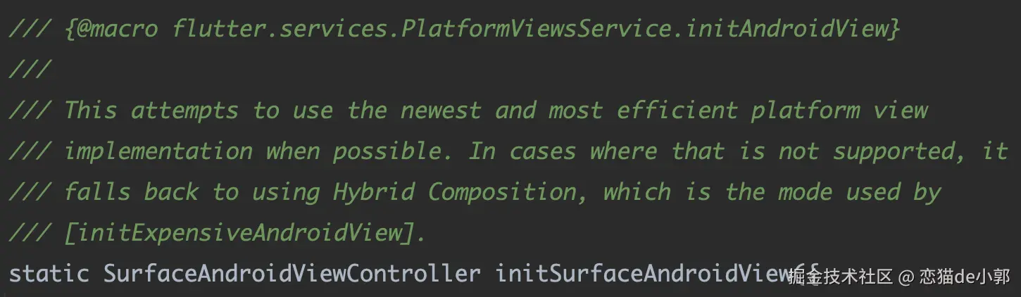 那么,回到本次的主题 ,针对全新的 HCPP 实现,Flutter 提供了全新的 API initHybridAndroidView ,可以看到,它需要 Vulkan 和 API 34 的环境才支持使用,如果从这点看,它的通用性又相对较低: