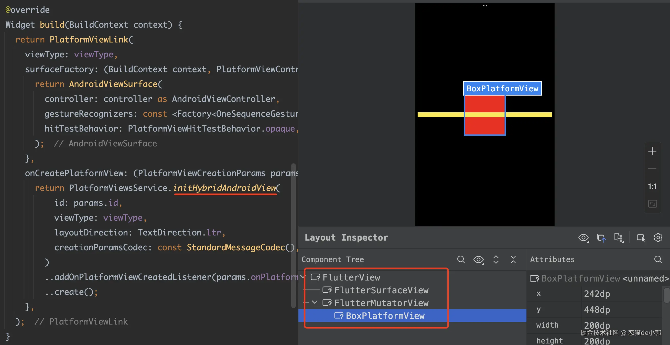 然后我们再通过 initAndroidView 来使用 TLHC 模式,可以看到此时是通过 PlatformViewWrapper 这个 parent 作为容器来承载,而 PlatformViewWrapper 会替换掉原生 BoxPlatformView 的 Canvas,让原生控件的内容渲染到指定 Surface 上 :