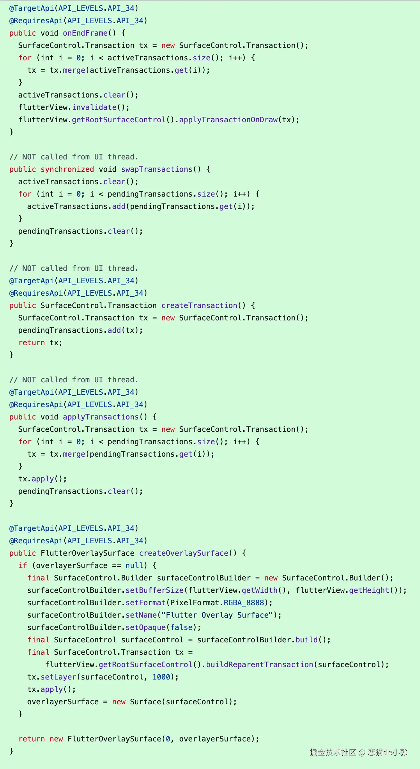 至于为什么需要 API 34, 主要也是 SurfaceControl 对应的一些 API 需要的版本都很高,另外我依稀记得, Android 14 在通过 SurfaceControl 实现低延迟绘图时,可以更好支持 Canvas API 通过硬件加速绘制到 HardwareBuffer :