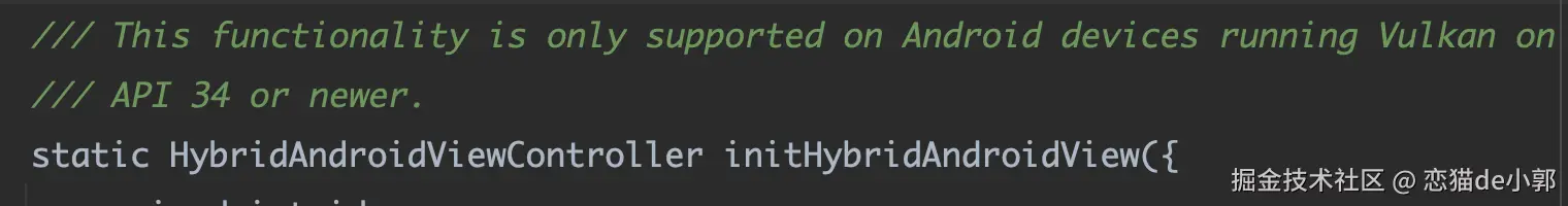 那么,回到本次的主题 ,针对全新的 HCPP 实现,Flutter 提供了全新的 API initHybridAndroidView ,可以看到,它需要 Vulkan 和 API 34 的环境才支持使用,如果从这点看,它的通用性又相对较低: