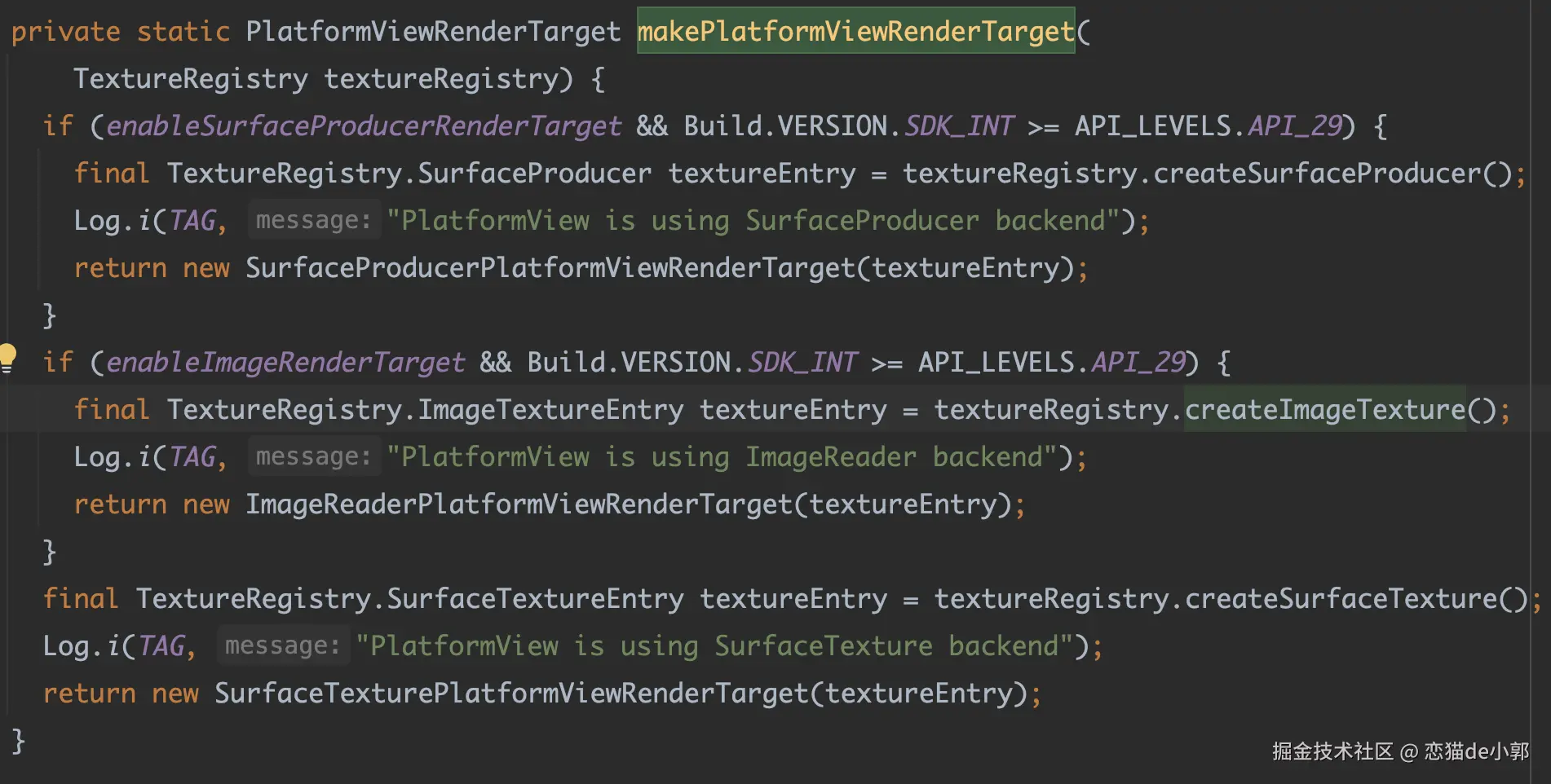 因为在此之前,Android 上的 Flutter 引擎支持两个外部渲染源:SurfaceTexture (OpenGLES 纹理)和 ImageReader(GPU-ready buffer),其中 Image.getHardwareBuffer 需要 API 28 支持。