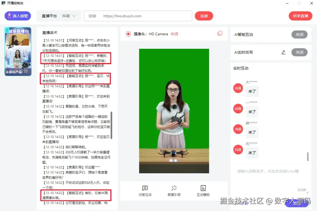 开播后,智能学习直播间的产品话术。当直播间用户在公屏上提出问题时,数字人主播能够迅速响应,实现一对一的智能回复,为用户提供及时、准确的解答。 上传直播间已经准备好的话术即可实现!
