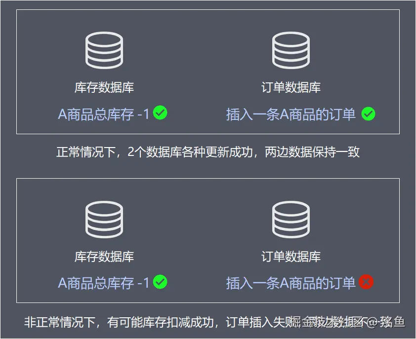 可以看到,如果多个数据库之间的数据更新没有保证事务,将会导致出现子系统数据不一致,业务出现问题。