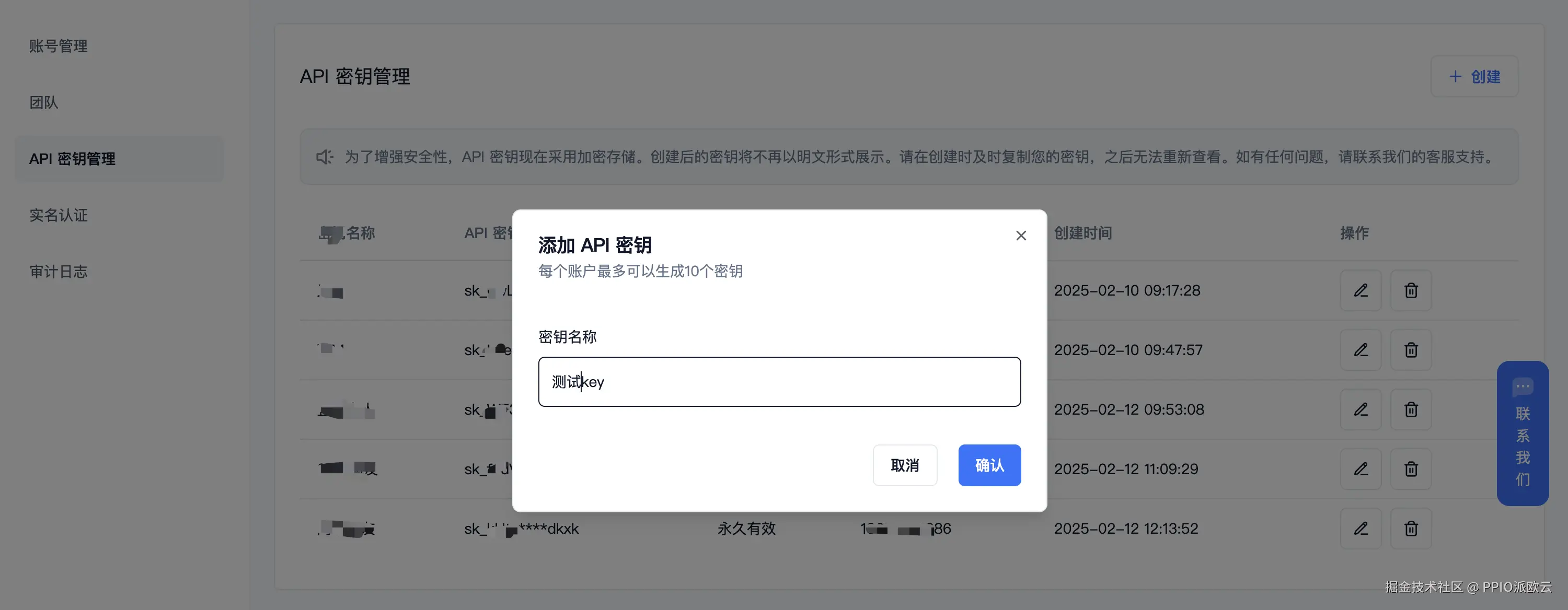 登录派欧云控制台 API秘钥管理 页面,点击创建按钮。