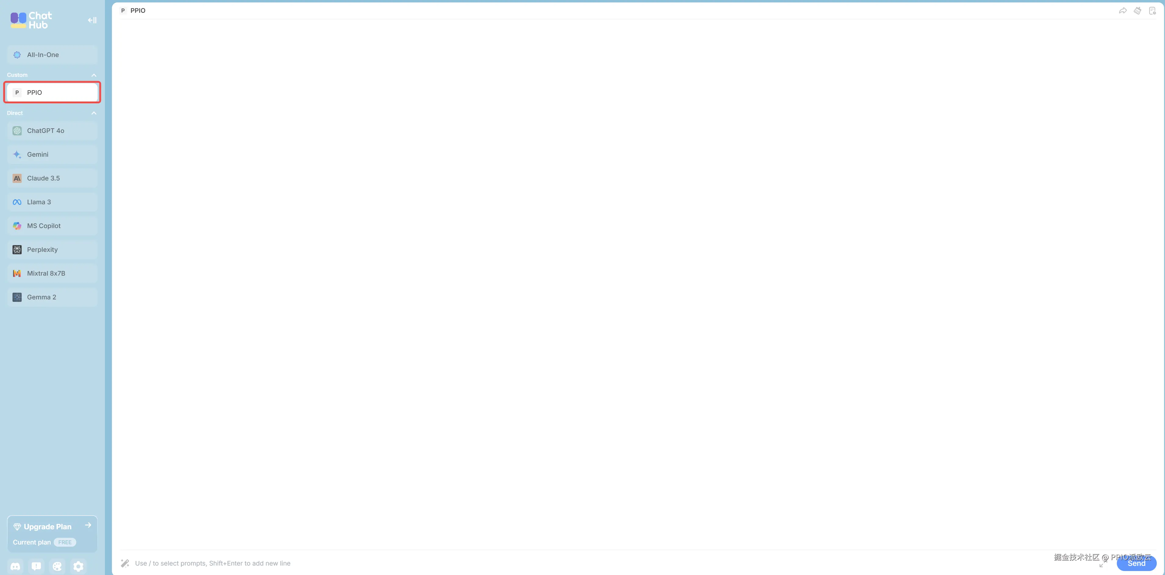 在侧边栏的自定义模型列表中,选择“PPIO”即可启动对话。