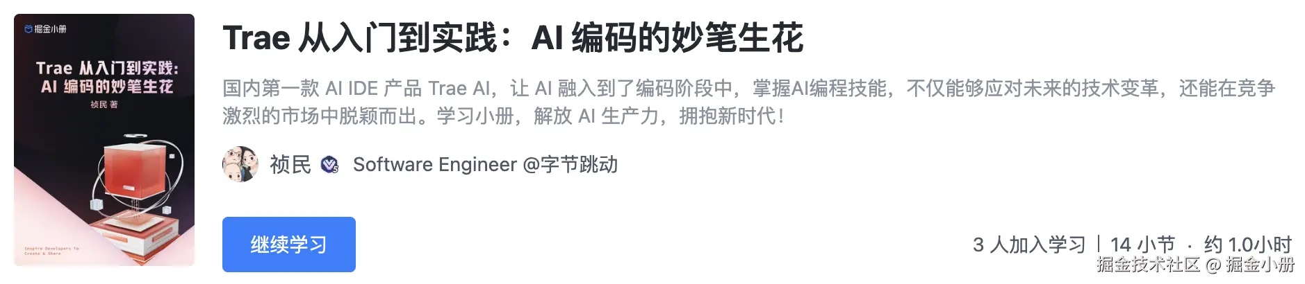 想知道 Trae AI 如何实现高效开发?这本小册从开发者及社区 IC 视角出发,带你由浅入深、从理论到实践,了解 Trae AI 功能,对比竞品异同,开启提效编程之旅,快来学习吧!
