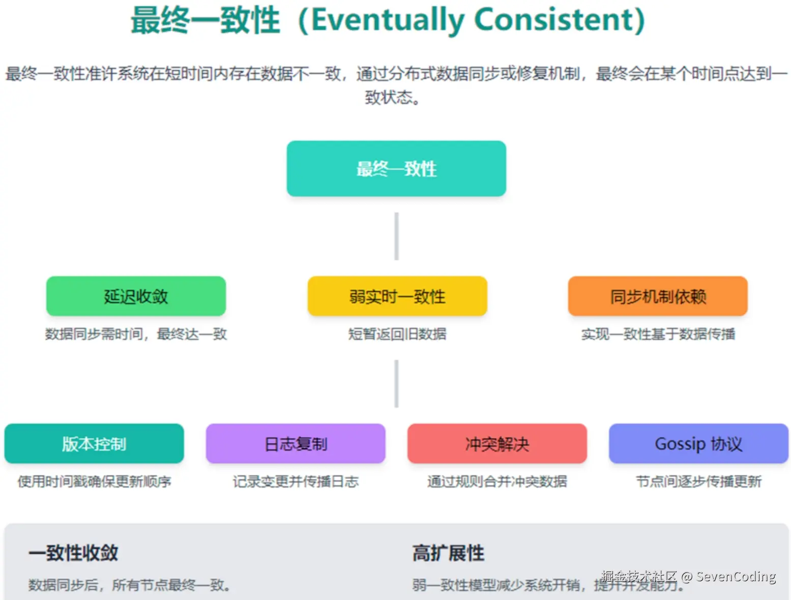 - 延迟收敛:数据同步和修复处理可能需要一定的时间,但只要没有新的数据更改,系统最终会达到一致状态(即全局一致性)。