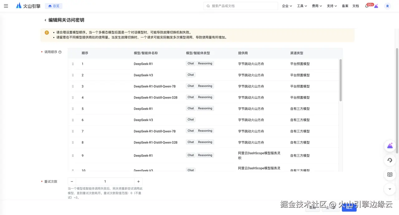 完成模型选择后,您可以通过手动调整上一步所选模型的顺序实现不同厂商、不同尺寸的服务调用故障无感转移。根据您所配置的顺序,前一个模型调用失败后,边缘大模型网关将自动依次调用后续模型,直到成功调用一个模型。如您想保证 DeepSeek-R1 的成功调用,可以通过配置来自不同提供商的 R1 模型来实现多厂商轮询。如您需要在资源受限的场景下进行调用,可以通过配置由字节跳动火山方舟与阿里云 DashScope 模型服务灵积提供的小尺寸蒸馏模型,通过降级备用保证最优效果。
