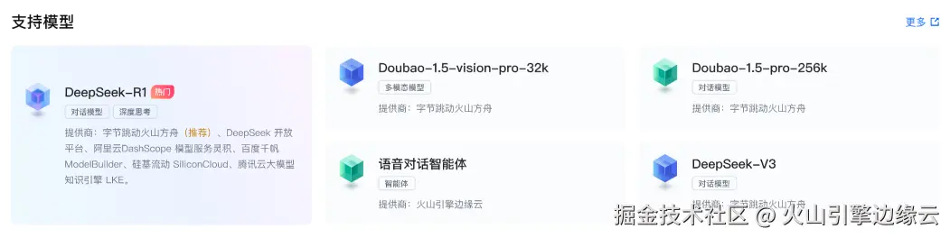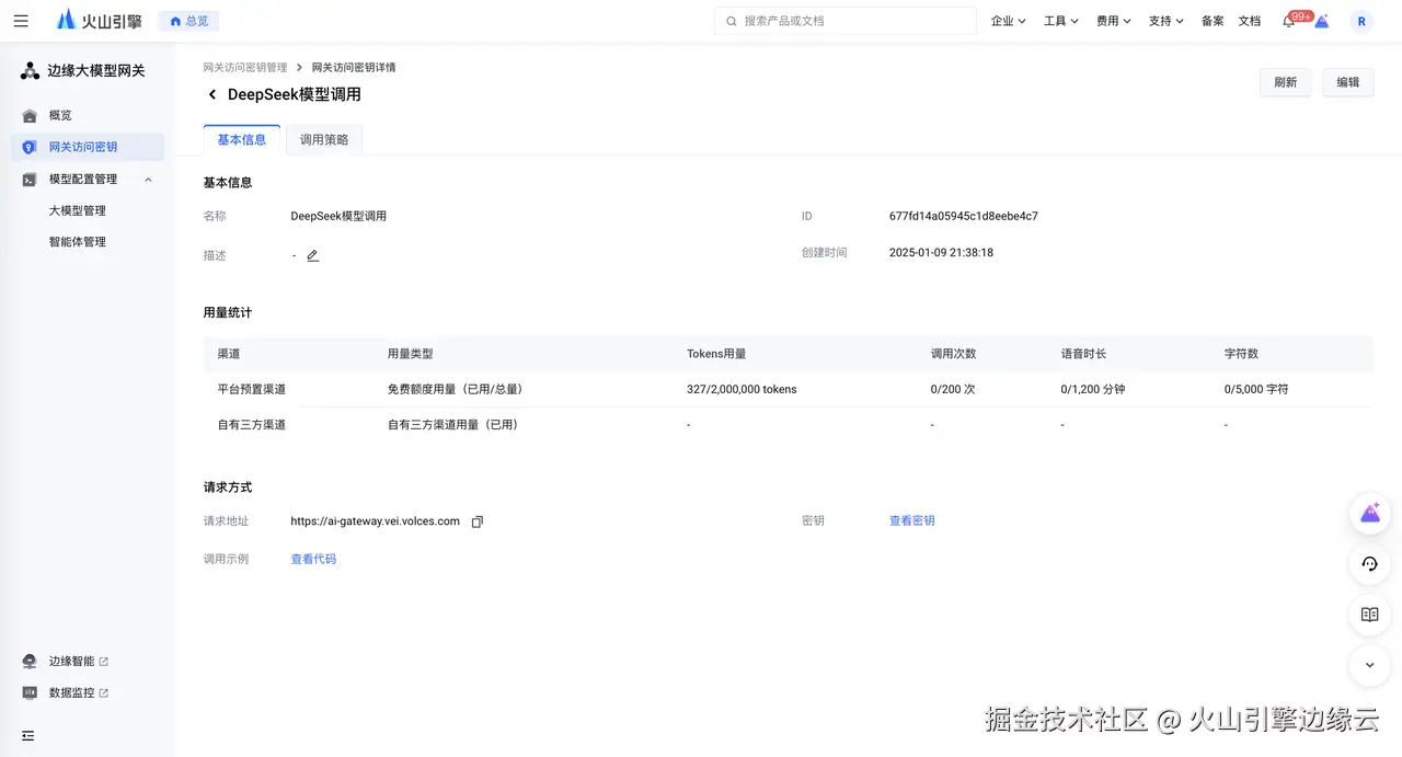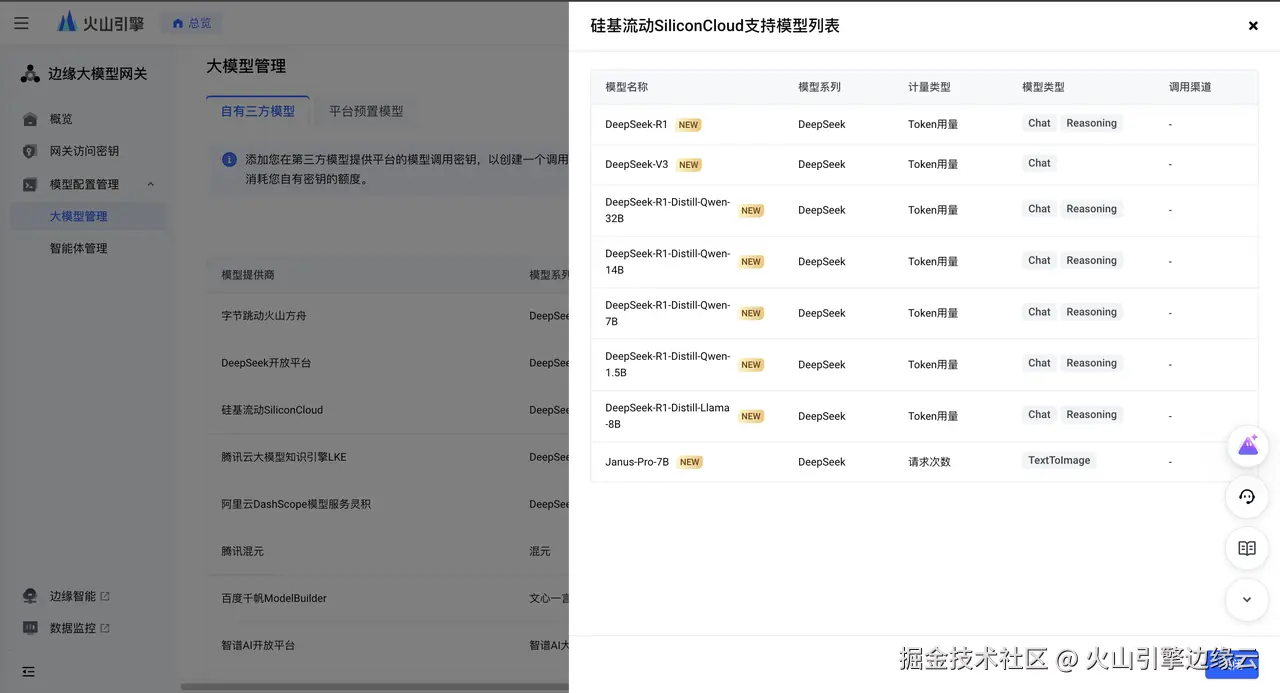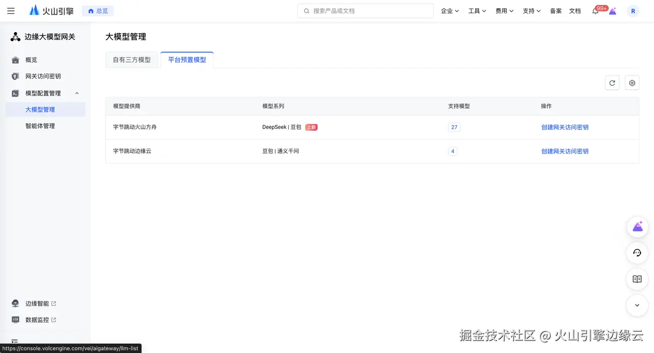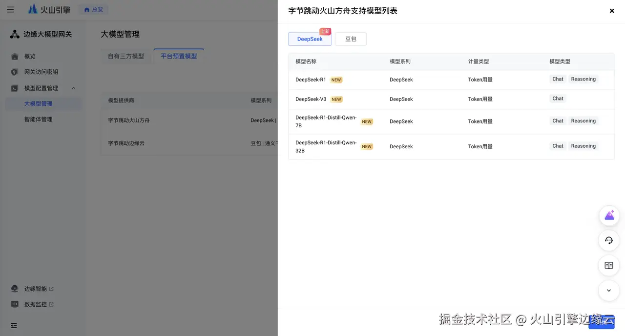 同时,您也可以通过边缘大模型网关的平台预置模型实现由火山方舟提供的 DeepSeek 模型一键调用,无需与三方模型提供商进行交互或创建调用渠道,您可直接用于通过网关访问密钥的模型配置与调用。