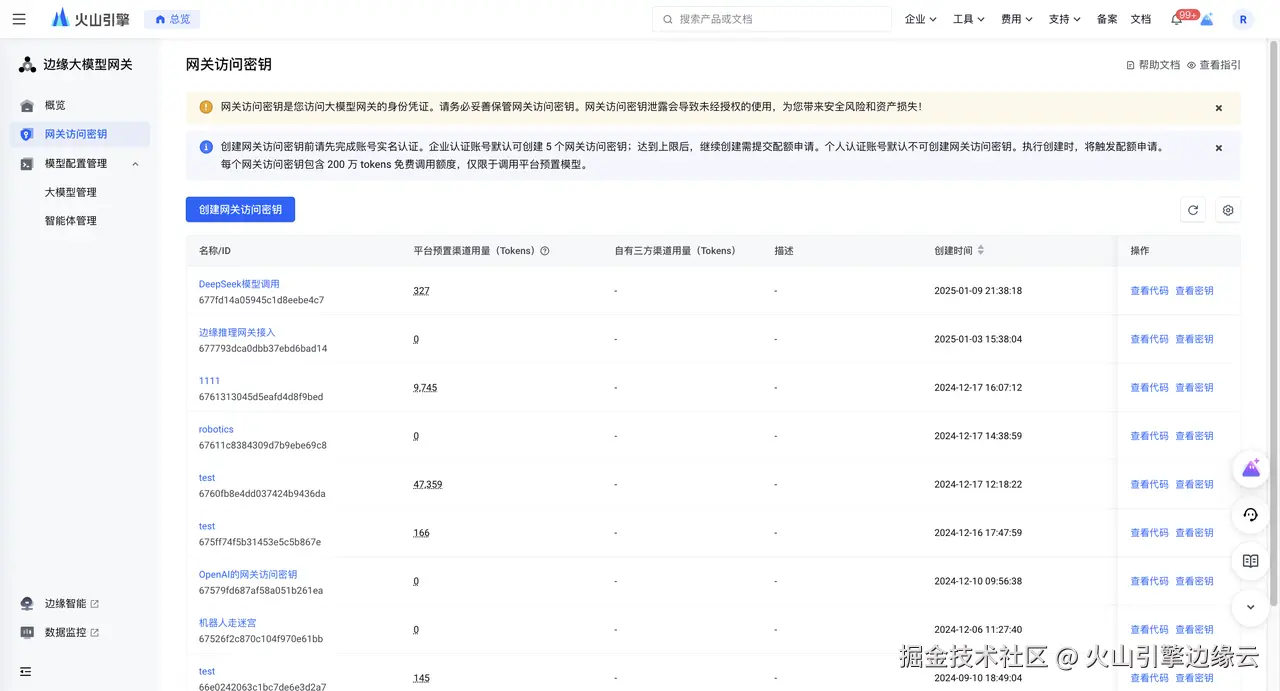 完成用于边缘大模型网关调用的模型配置后,您可以开始为您的业务场景创建 DeepSeek 调用的网关访问密钥(API)。
