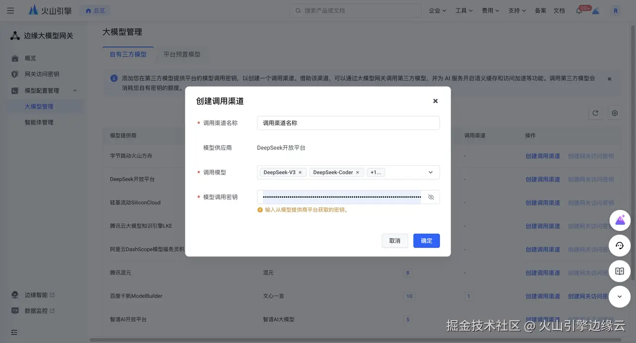 使用大模型网关调用自有三方模型,您必须在大模型网关通过创建渠道配置您在第三方平台 AI 服务平台中的调用密钥,不同模型提供商平台获取方式可能存在不同(详情:www.volcengine.com/docs/6893/1… DeepSeek 系列模型。
