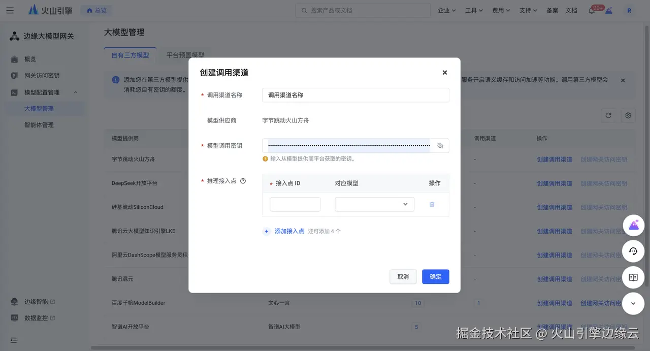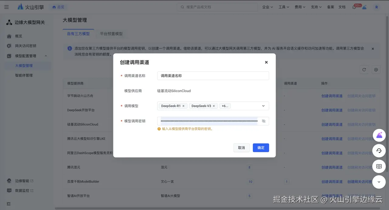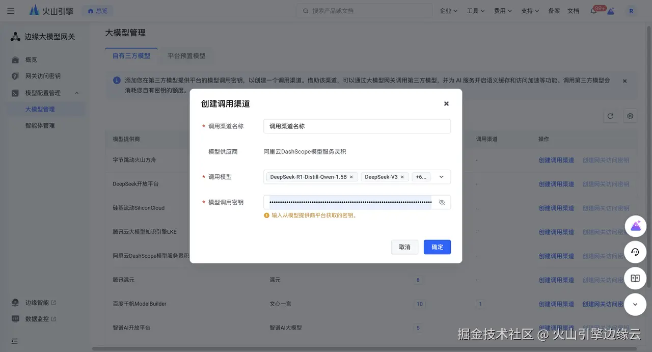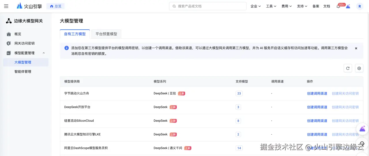 您可以使用边缘大模型网关的自有三方模型调用功能,通过创建调用渠道将您在第三方模型平台的密钥纳管至边缘大模型网关,实现通过边缘大模型网关签发网关访问密钥进行对应模型的访问与调用。同时,边缘大模型网关也通过平台预置模型助力您直接使用由火山方舟提供的 DeepSeek R1、DeepSeek V3、DeepSeek-R1-Distill-Qwen-7B/32B 模型调用,无需与三方模型提供商交互,使用更便捷。