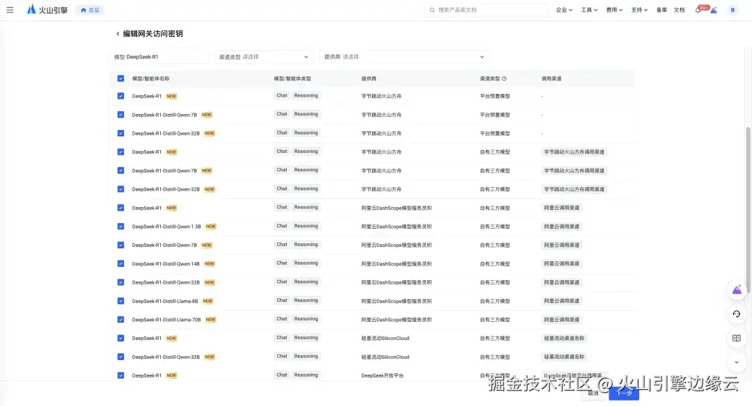 在创建网关访问密钥的第一步,您首先需要选择可通过该网关访问密钥进行调用的 DeepSeek 模型,您可以通过勾选来自多个提供商的 DeepSeek 模型轻松在多厂商间实现故障迁移,您也可以通过配置不同尺寸的蒸馏版本模型,实现降级备用,增加稳定保障。